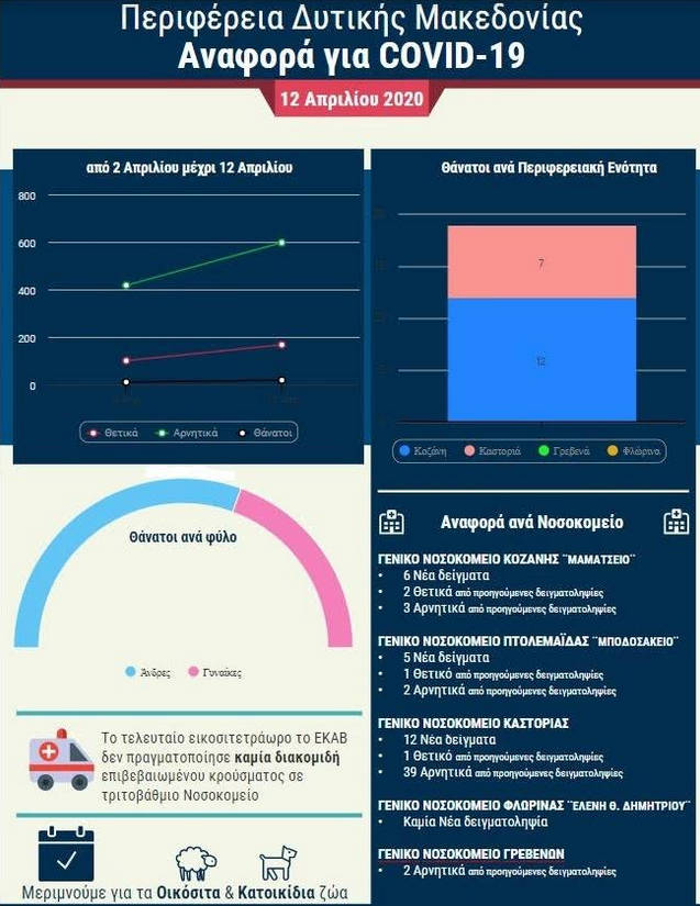 Η Περιφέρεια Δυτικής Μακεδονίας δίνει στη δημοσιότητα αναλυτικά την  εξέλιξη των κρουσμάτων κορωνοϊού. Η εικόνα ως προς τα  κρούσματα και τα ύποπτα κρούσματα για κορωνοϊό στην Δυτική Μακεδονία σήμερα (Κυριακή, 12 Απριλίου 2020) στα νοσοκομεία της Περιφέρειας έχει ως εξής: