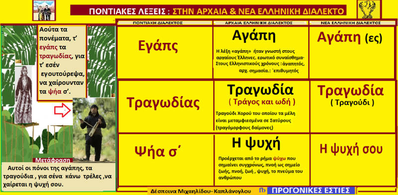 Στην ποντιακή διάλεκτο” τα τραγωδίας ” σήμαινε τα τραγούδια.