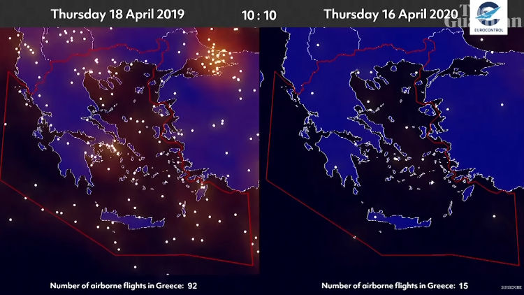 Ενδεικτικό της κατάστασης που έχει διαμορφωθεί, είναι το βίντεο που κυκλοφόρησε ο διεθνής αεροπορικός οργανισμός Eurocontrol, στο οποίο απεικονίζονται γραφικά το πλήθος πτήσεων στον ευρωπαϊκό εναέριο χώρο τον Απρίλιο του 2019 και αυτές του φετινού Απριλίου. Η κυκλοφορία μειώθηκε κατά 90% συγκριτικά με τον Απρίλιο του 2019.