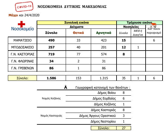Η Περιφέρεια Δυτικής Μακεδονίας δίνει στη δημοσιότητα αναλυτικά την  εξέλιξη των κρουσμάτων κορωνοϊού. Η εικόνα ως προς τα  κρούσματα και τα ύποπτα κρούσματα για κορωνοϊό στην Δυτική Μακεδονία σήμερα (Παρασκευή, 24 Απριλίου 2020) στα νοσοκομεία της Περιφέρειας έχει ως εξής:
