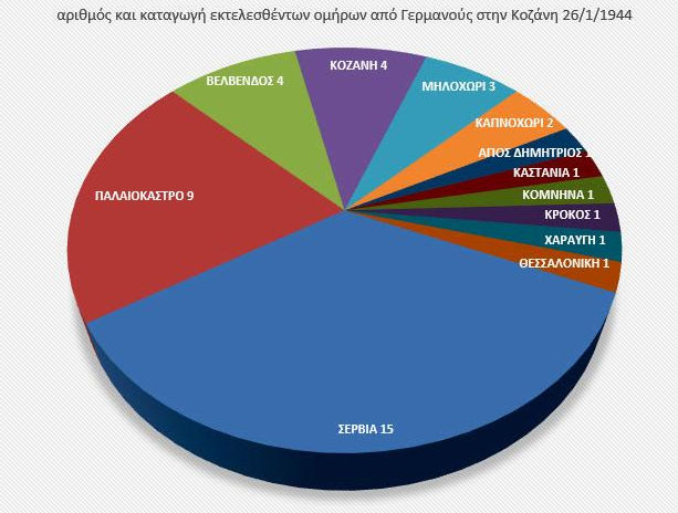 Εκτελεσθέντες όμηροι 26/1/1944. Τον βαρύτερο φόρο πλήρωσαν άμαχοι των Σερβίων, που είχαν πυρποληθεί νωρίτερα από τους Ιταλούς, και του Παλαιοκάστρου, οικισμού από τον οποίο εξορμούσαν οι αντάρτες του ΕΛΑΣ