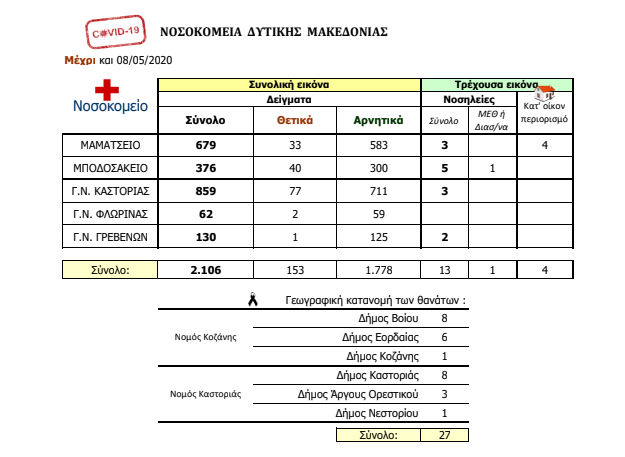 Συνολικά από τα πέντε Νοσοκομεία της Δυτικής Μακεδονίας εστάλησαν μέχρι σήμερα 2.106 δείγματα. Τα θετικά παραμένουν 153 και τα αρνητικά ανέρχονται σε 1.778.