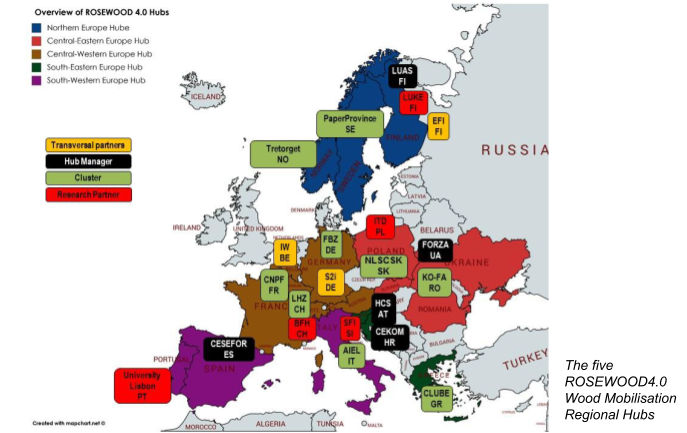 Το ROSEWOOD4.0 ομαδοποιεί περιφέρεις με δασική ξυλεία σύμφωνα με τη γεωγραφική θέση και τα κοινά τους χαρακτηριστικά για να δημιουργήσει πέντε περιφερειακούς κόμβους διακίνησης ξύλου: