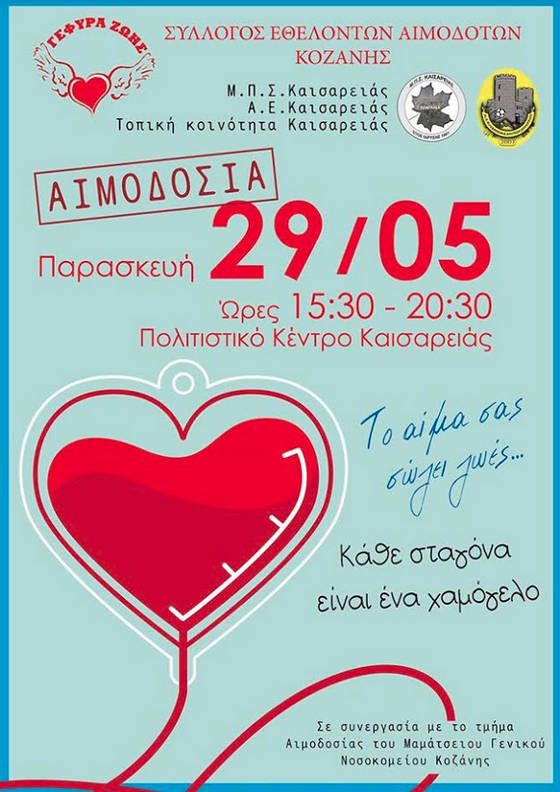 Την Παρασκευή 29 Μαΐου 2020 και ΩΡΑ 15:30-20:00 στην Αίθουσα του Πνευματικού Κέντρου του Δ.Δ της Καισαρειάς διοργανώνεται Αιμοδοσία του Σ.Ε.Α. Κοζάνης, σε συνεργασία με τον Μορφωτικό- Πολιτιστικό Σύλλογο Καισαρειάς, Α.Ε. Καισαρειάς, Τοπική Κοινότητα Καισαρειάς και το τμήμα Αιμοδοσίας του Μαμάτσειου Γενικού Νοσοκομείου Κοζάνης.