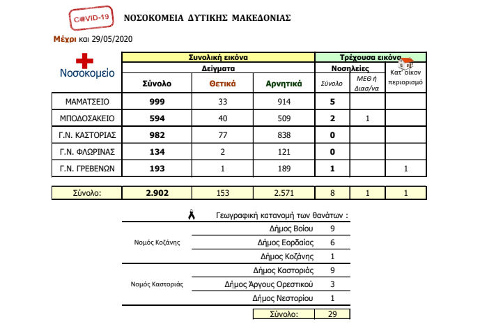 Η Περιφέρεια Δυτικής Μακεδονίας δίνει στη δημοσιότητα αναλυτικά την εξέλιξη των κρουσμάτων κορωνοϊού. Η εικόνα ως προς τα κρούσματα και τα ύποπτα κρούσματα για κορωνοϊό στην Δυτική Μακεδονία σήμερα (Παρασκευή, 29 Μαΐου 2020) στα νοσοκομεία της Περιφέρειας έχει ως εξής: