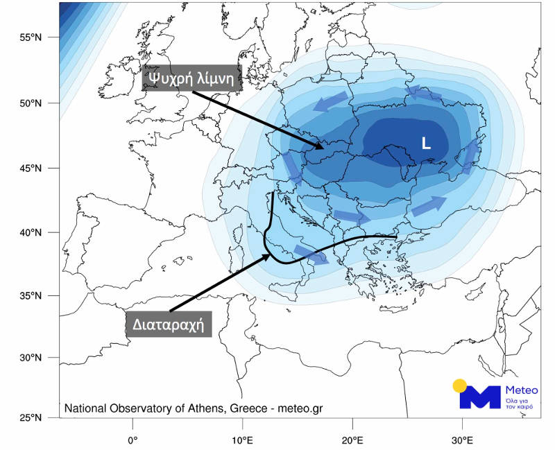 Χάρτης 1. Η «Ψυχρή Λίμνη» (αποχρώσεις του μπλε) με κέντρο χαμηλών πιέσεων πάνω από την Ουκρανία, περιβάλλεται από διαταραχές που κινούνται προς τη χώρα μας (μαύρη καμπύλη). Τα βέλη δείχνουν την πορεία των αερίων μαζών.