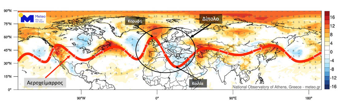 Χάρτης 2. Η απόκλιση της θερμοκρασίας στην κατώτερη ατμόσφαιρα από τις φυσιολογικές για την εποχή τιμές σε σχέση με την περίοδο 1981-2010. Η κόκκινη καμπύλη δείχνει τη θέση και την κίνηση του αεροχειμάρρου. Ο μαύρος κύκλος περικλείει το δίπολο θερμών και ψυχρών αερίων μαζών πάνω από την Ευρώπη.