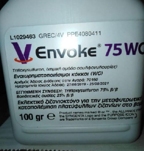 Συγκεκριμένα, προσκομίστηκε φωτογραφία σκευάσματος με το ηλεκτρονικό ταχυδρομείο που φέρει την εμπορική ονομασία “ENVOKE 75WG” με πλαστή Ελληνική ετικέτα. Το προϊόν δεν έχει λάβει κατά παρέκκλιση άδεια διάθεσης στην αγορά, παρόλα αυτά στην ετικέτα του εικονιζόμενου σκευάσματος αναφέρεται ότι έχει δήθεν «Ημερομηνία Ισχύος Άδειας: 27/08/2019-25/08/2021», το οποίο δεν ανταποκρίνεται στην πραγματικότητα. Το εικονιζόμενο σκεύασμα είναι μη εγκεκριμένο, αγνώστου σύστασης.