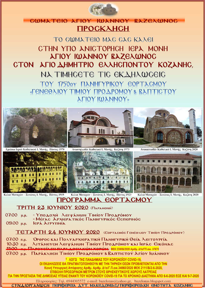 ΑΓΙΟΥ ΙΩΑΝΝΟΥ ΒΑΖΕΛΩΝΟ ΣΤΟΝ ΑΓΙΟ ΔΗΜΗΤΡΙΟ ΕΛΛΗΣΠΟΝΤΟΥ ΚΟΖΑΝΗΣ, ΝΑ ΤΙΜΗΣΕΤΕ ΤΙΣ ΕΚΔΗΛΩΣΕΙΣ TOY 1750oυ ΠΑΝΗΓΥΡΙΚΟΥ ΕΟΡΤΑΣΜΟΥ «ΓΕΝΕΘΛΙΟΥ ΤΙΜΙΟΥ ΠΡΟΔΡΟΜΟΥ & ΒΑΠΤΙΣΤΟΥ ΑΓΙΟΥ ΙΩΑΝΝΟΥ»