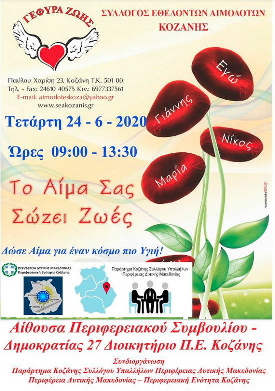 Η Περιφέρεια Δυτικής Μακεδονίας – Π.Ε. Κοζάνης σε συνεργασία με το Παράρτημα Κοζάνης του Συλλόγου Υπαλλήλων Περιφέρειας και το Σύλλογο Εθελοντών αιμοδοτών Κοζάνης «Γέφυρα Ζωής» διοργανώνει εθελοντική αιμοδοσία , η οποία θα γίνει στην αίθουσα του Περιφερειακού Συμβουλίου στο κτίριο της Π.Ε. Κοζάνης (Δημοκρατίας 27, κτίριο πρώην Νομαρχίας Κοζάνης), Την Τετάρτη 24 Ιουνίου 2020, μεταξύ 9:00 και 14:00 (Προσέλευση ως 13:30).