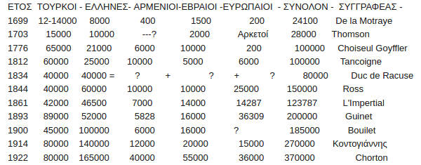 Επίσης βλέπει να αλλοιώνεται η εθνολογική σύνδεση της και ενώ το 1699 το ποσοστό των Οθωμανών είναι 49.90% έως 58.33% και των Ελληνορθοδόξων 33,20% το 1922 να κατεβαίνει για τους Οθωμανούς στο 21.62% και των Ελληνορθόδοξων να ανεβαίνει στο 44.59 % με την σύγχρονη μεγάλη αύξηση Εβραίων, Αρμενίων και πολλών άλλων εθνοτήτων από την Ευρώπη που από 8,47% ανεβαίνει στο 33.39 %