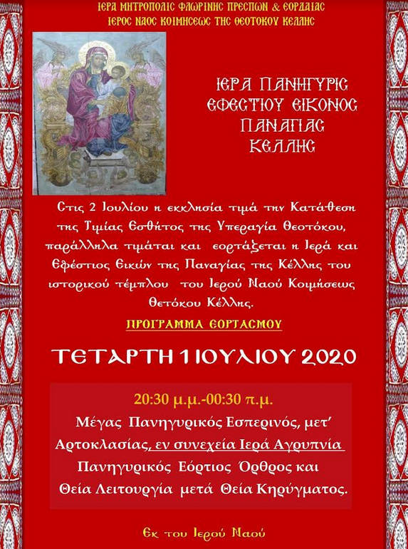 Στις 2 Ιουλίου η εκκλησία τιμά την Κατάθεση της Τιμίας Εσθήτος της Υπεραγία Θεοτόκου, παράλληλα τιμάται και εορτάζεται στις 2 Ιουλίου εκάστου έτους η Ιερά και Εφέστιος Εικών της Παναγίας της Κέλλης του ιστορικού τέμπλου του Ιερού Ναού Κοιμήσεως Θετόκου Κέλλης.