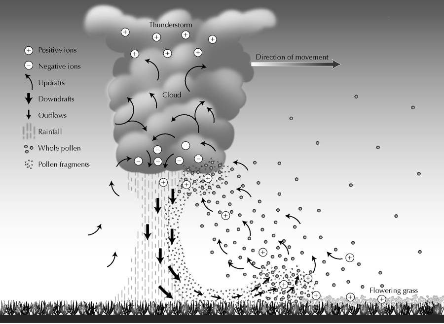 Ωστόσο, ο συνδυασμός των ισχυρών βροχοπτώσεων και της ατμοσφαιρικής πίεσης και της υγρασίας της καταιγίδας προκαλούν τη διάσπαση των κόκκων της γύρης ώστε να απελευθερώνονται επιβλαβείς αλλεργιογόνες ουσίες.