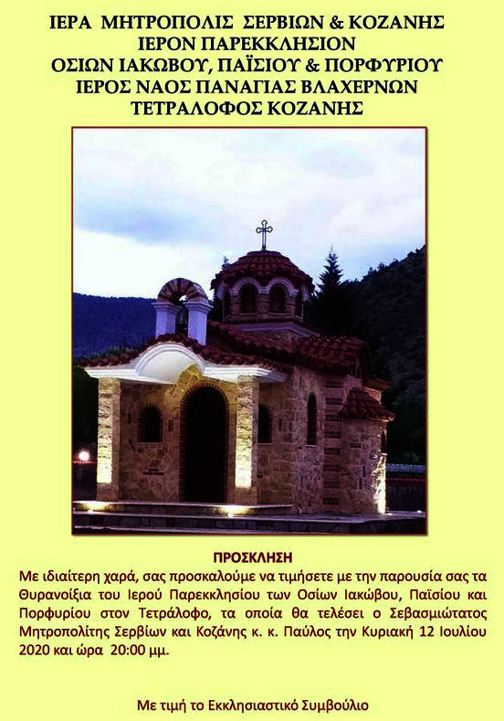 Κοζάνη 06/07/2020 Τα Θυρανοίξια του Ιερού Παρεκκλησίου των Οσίων Ιακώβου, Παϊσίου και Πορφυρίου στον Τετράλοφο Κοζάνης 0 Τα Θυρανοίξια του Ιερού Παρεκκλησίου των Οσίων Ιακώβου, Παϊσίου και Πορφυρίου στον Τετράλοφο Κοζάνης: