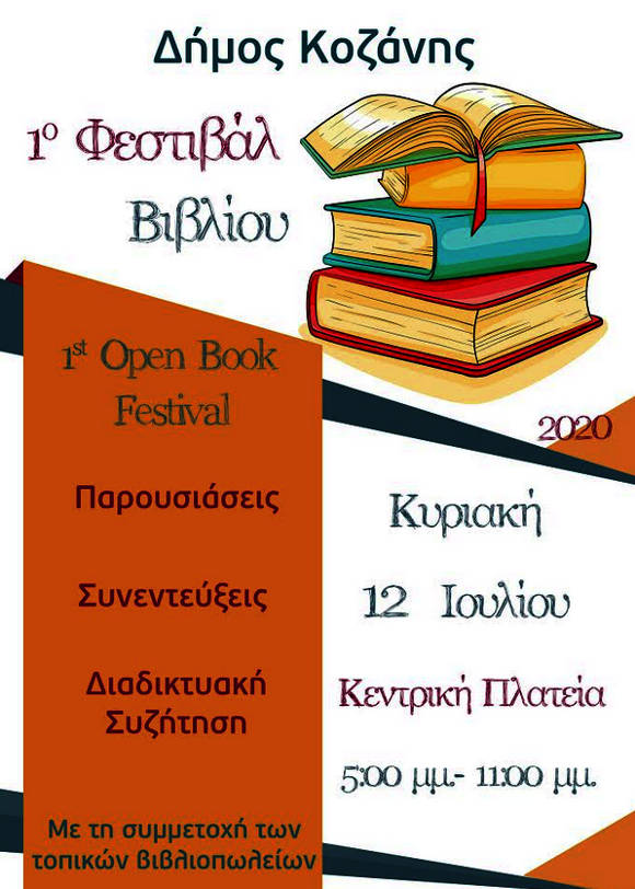 Το 1ο Φεστιβάλ Βιβλίου του Δήμου Κοζάνης θα πραγματοποιηθεί την Κυριακή 12 Ιουλίου 2020, 17:00 – 23:00, στην κεντρική πλατεία της πόλης (Πλατεία Νίκης), μετά την πρόσφατη αναβολή του λόγω των κακών καιρικών συνθηκών.