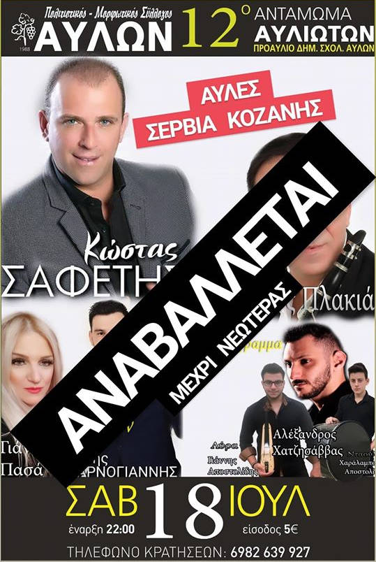 Ευχαριστούμε θερμά τον κ. Κώστα Σαφέτη,όλους τους καλλιτέχνες αλλά και τους υπόλοιπους συντελεστές της εκδήλωσης για την άμεση συννενόηση τους μαζί μας,ώστε να αποφασιστεί αυτή η αναβολή!