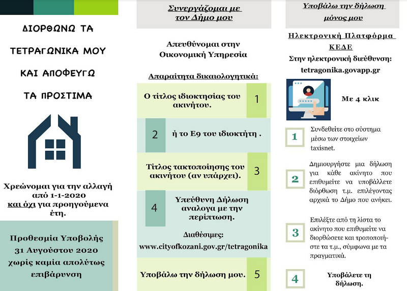 Επίσης, λόγω των συνθηκών και για την αποφυγή του συνωστισμού στις υπηρεσίες συστήνεται ή χρήση της εφαρμογής taxisnet (www.gsis.gr) στην διεύθυνση tetragonika.govapp.gr, χωρίς δικαιολογητικά και έντυπη αίτηση, για τις περιπτώσεις 1. και 2.