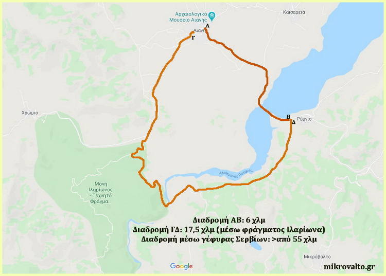 Ιδιαίτερα για τις επαγγελματικές ή προσωπικές μετακινήσεις μεταξύ των όμορων οικισμών Ρυμνίου, Αιανής, Καισαρειάς, οι κάτοικοι θα αναγκαστούν να διανύσουν αντί των 6 χλμ (απόσταση από Αιανή-έξοδο γέφυρα από την πλευρά του Ρυμνίου), περισσότερα από 55 χλμ. μέσω Κοζάνης ή Βαθυλάκκου, γέφυρας Σερβίων, Αυλών! Εδώ, για τους κατοίκους αυτών των οικισμών, θα πρέπει να δοθεί σε κυκλοφορία η εναλλακτική παρακαμπτήριος μέσω φράγματος Ιλαρίωνα (απόσταση Αιανή – έξοδος γέφυρας στην πλευρά του Ρυμνίου 17,5 χλμ) που επιφέρει πρόσθετη διαδρομή 11,5 χλμ.