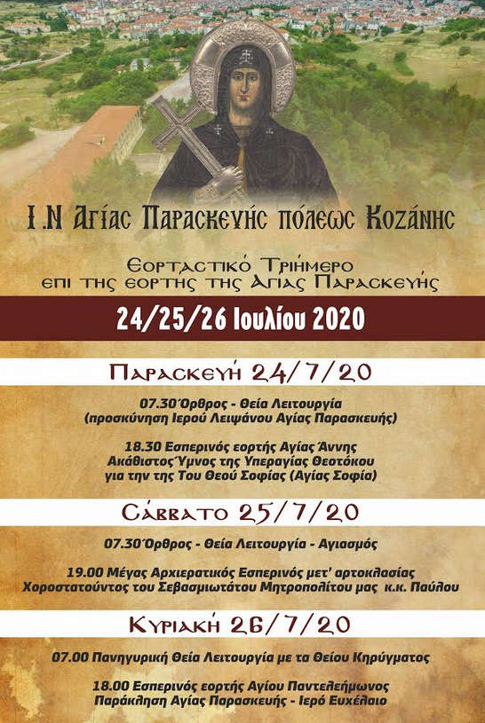 Κοζάνη 22/07/2020 Ο εορτασμός της Αγίας Παρασκευής στον ομώνυμο Ι.Ν. στην Κοζάνη – Τριήμερο εκδηλώσεων 1 Ο εορτασμός της Αγίας Παρασκευής στον ομώνυμο Ι.Ν. στην Κοζάνης. Περισσότερες πληροφορίες στην παρακάτω αφίσα: