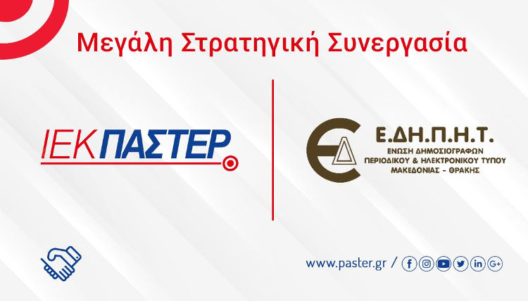 Το ΙΕΚ ΠΑΣΤΕΡ στο πλαίσιο της στρατηγικής του για σύναψη συνεργασιών με διακεκριμένους επιστημονικούς και ερευνητικούς φορείς που αποσκοπούν στην προαγωγή του εκπαιδευτικού, κοινωνικού και ερευνητικού έργου του, προχωρά σε μια πολύ σημαντική σύναψη συνεργασίας με την Ένωση Δημοσιογράφων Περιοδικού και Ηλεκτρονικού Τύπου (Ε.ΔΗ.Π.Η.Τ.) Μακεδονίας – Θράκης.