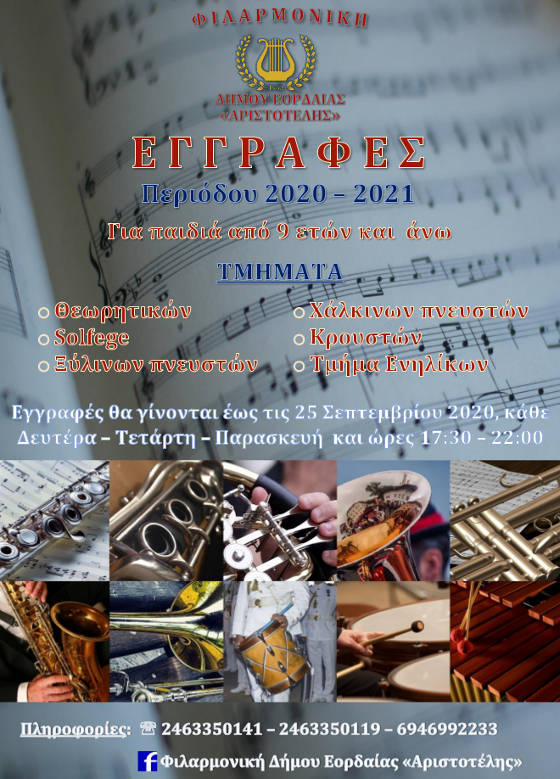 Η Φιλαρμονική του Δήμου Εορδαίας «Αριστοτέλης», ανακοινώνει  την έναρξη  εγγραφών για την περίοδο 2020 – 2021.