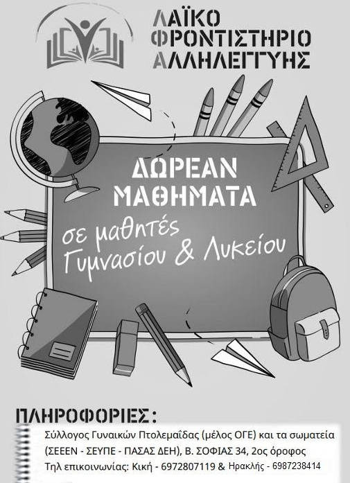 Ο Σύλλογος Γυναικών Πτολεμαΐδας και τα σωματεία που διοργανώνουν το Λαϊκό Φροντιστήριο Αλληλεγγύης, απευθύνουν ιδιαίτερο κάλεσμα στους εκπαιδευτικούς της περιοχής να υποστηρίξουν με την συμμετοχή τους την πρωτοβουλία. Εν ενεργεία καθηγητές, αδιόριστοι ή όσοι απασχολούνται σε άσχετα επαγγέλματα αλλά ακόμα και συνταξιούχοι μπορούν να απευθυνθούν στα τηλέφωνα: Κική 6972807119 και Ηρακλής 6987238414.