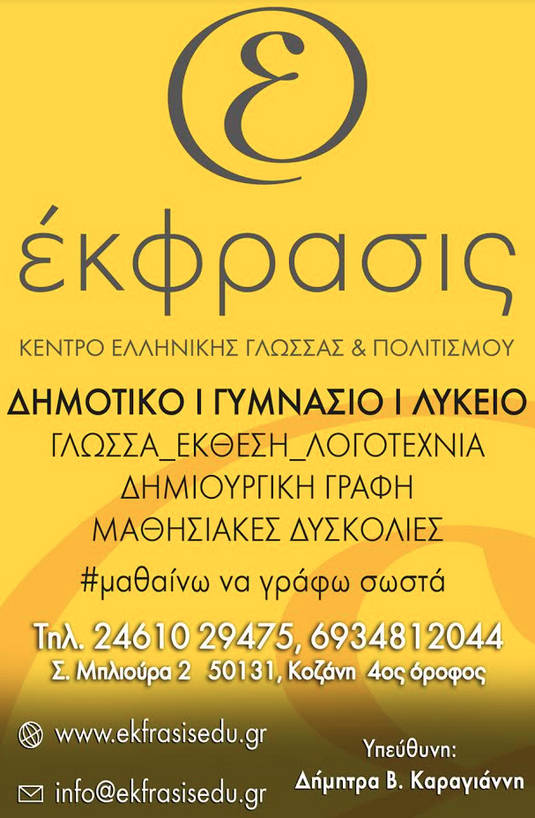 Η «Έκφρασις» είναι ένα Κέντρο Ελληνικής Γλώσσας, εξειδικευμένο στην παραγωγή γραπτού λόγου. Ασχολείται αποκλειστικά με μαθήματα Έκθεσης, Γλώσσας και Λογοτεχνίας στο Δημοτικό, το Γυμνάσιο και το Λύκειο, με μαθησιακές δυσκολίες στην γραπτή έκφραση και την ανάγνωση, καθώς και με μαθήματα Δημιουργικής Γραφής για παιδιά.