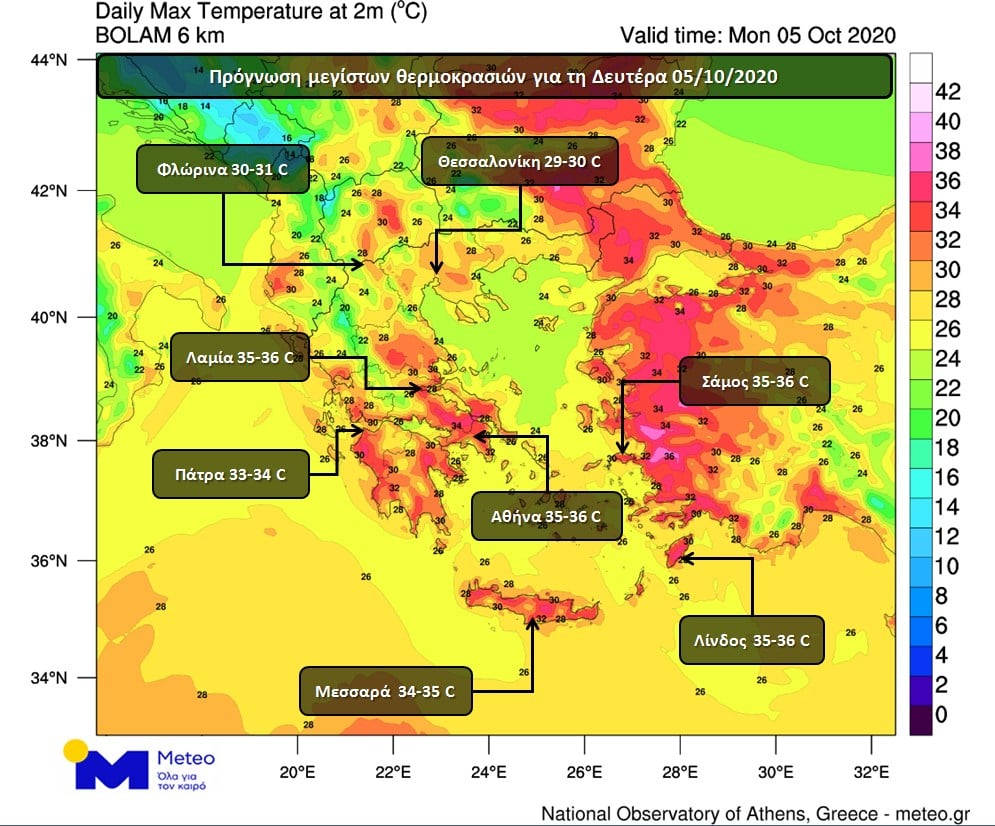 Σε ιδιαίτερα υψηλά για την εποχή επίπεδα αναμένεται να διατηρηθούν οι θερμοκρασίες έως και την Τετάρτη 07/10/2020 σύμφωνα με τα τελευταία διαθέσιμα προγνωστικά στοιχεία του Εθνικού Αστεροσκοπείου Αθηνών / meteo.gr.