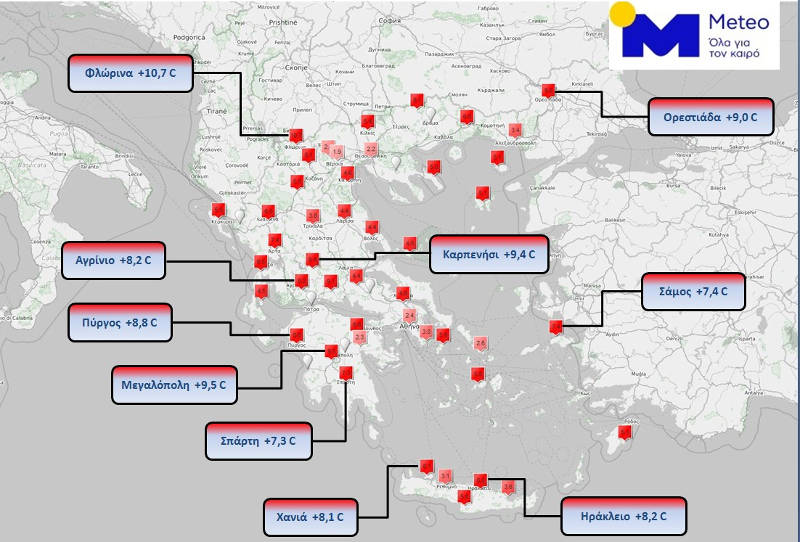 Αξίζει να σημειωθεί ότι την Κυριακή 04/10 οι μέγιστες θερμοκρασίες που καταγράφηκαν στη χώρα ήταν έως και 10,7 βαθμούς υψηλότερες σε σχέση με τις μέσες μέγιστες θερμοκρασίες του Οκτωβρίου για την περίοδο 2010-2019. Στο χάρτη του Εθνικού Δικτύου για την Κλιματική Αλλαγή που ακολουθεί παρουσιάζεται η απόκλιση της μέγιστης θερμοκρασίας την Κυριακή 04/10 σε 50 επιλεγμένους σταθμούς του Εθνικού Αστεροσκοπείου Αθηνών/meteo.gr.