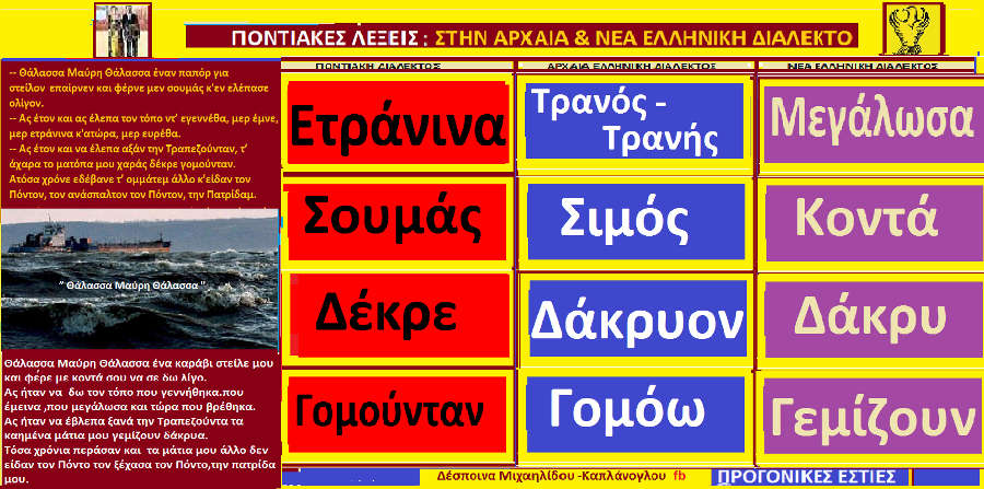 Στην σημερινή δημοσίευση θα δούμε το Ποντιακό τραγούδι ” Θάλασσα Μαύρη Θάλασσα ” από το οποίο διαλέξαμε τις 4 λέξεις, που θα δώσουμε και την αρχαιοελληνική προέλευση τους και φυσικά θα δώσουμε την σημερινή τους ερμηνεία στα νέα Ελληνικά.
