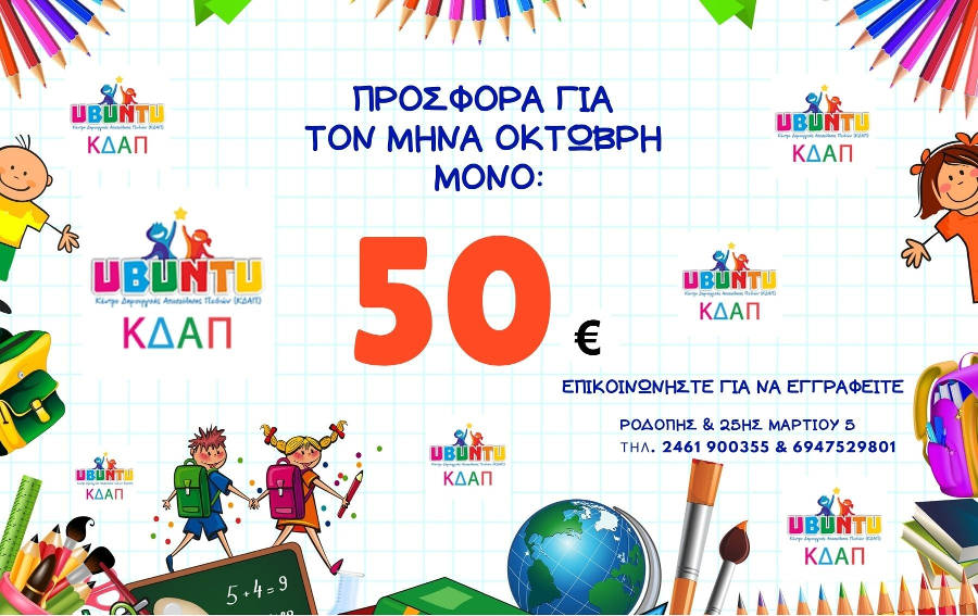 Προτάσεις 06/10/2020 Μεγάλη προσφορά για τον μήνα Οκτώβριο από το ΚΔΑΠ Ubuntu στην Κοζάνη 0 Μεγάλη προσφορά για τον μήνα Οκτώβριο από το ΚΔΑΠ Ubuntu στην Κοζάνη: