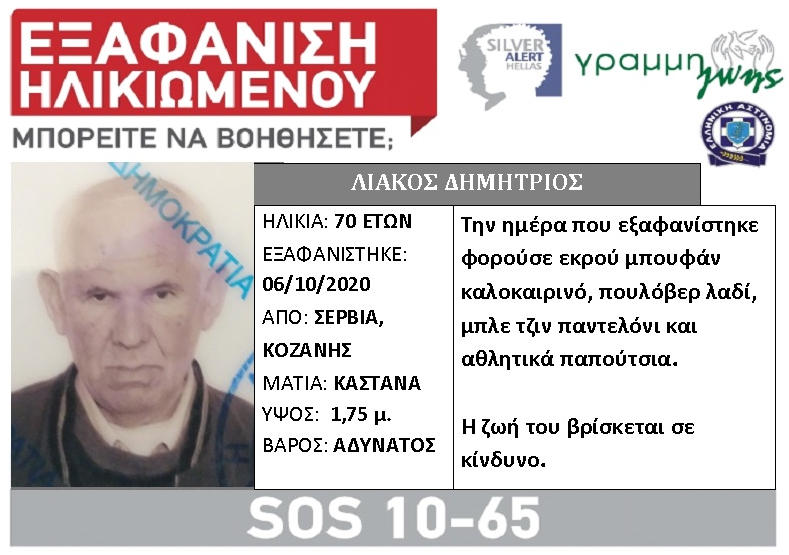 Σέρβια - Βελβεντό 08/10/2020 Silver Alert για την εξαφάνιση του 70χρονου Λιάκου Δημητρίου από τα Σέρβια Κοζάνης 0 Υπάρχει εξαφάνιση ηλικιωμένου από τα Σέρβια, Κοζάνης. Η ζωή του βρίσκεται σε κίνδυνο. Εάν γνωρίζετε κάτι επικοινωνήστε με την υπηρεσία Silver Alert, όλο το 24ωρο, στην Εθνική Γραμμή SOS 1065.