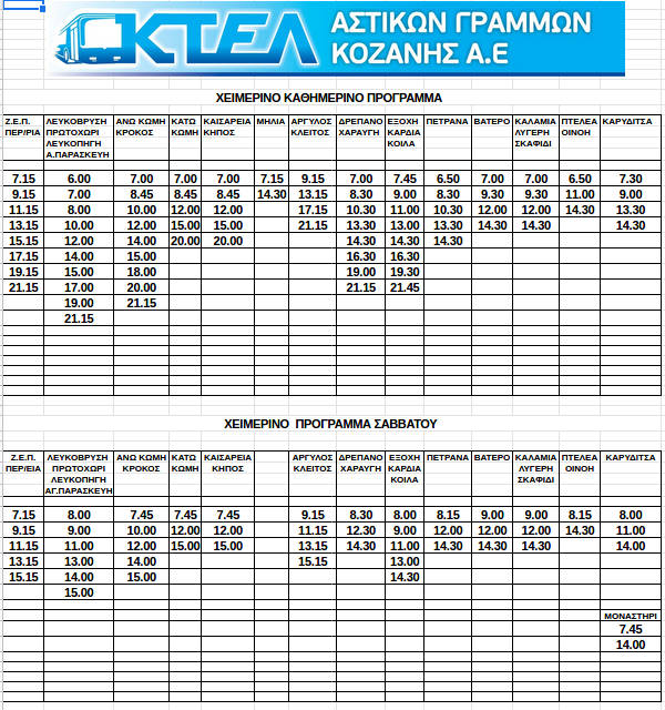 Κοζάνη 17/10/2020 Δείτε τα δρομολόγια των Αστικών Κοζάνης κατά τη διάρκεια της καραντίνας 0 Για το χρονικό διάστημα κατά το οποίο ισχύει η κήρυξη της περιφερειακής ενότητας Κοζάνης σε επίπεδο 4 “Αυξημένου κινδύνου” λόγω covid-19, τα δρομολόγια της ΚΤΕΛ Αστίκων γραμμών Κοζάνης Α.Ε. τροποποιούνται ως εξής :