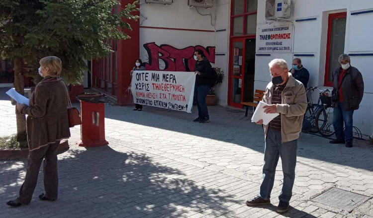 «Ούτε μια μέρα χωρίς τηλεθέρμανση. Καμία αύξηση στα τιμολόγια», ανάγραφε το πανό που κρατούσαν μέλη του Συντονιστικού, ενώ άλλα μέλη μοίραζαν την ενημερωτική ανακοίνωσή τους.