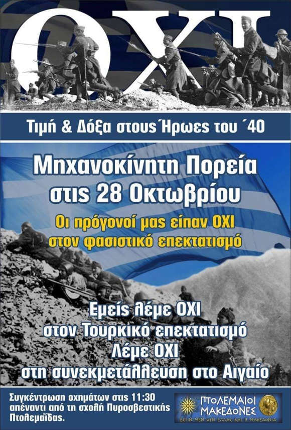 Καλούμε λοιπόν όλες και όλους με τις ΓΑΛΑΝΟΛΕΥΚΕΣ στα οχήματά σας (αυτοκίνητα, μοτοσικλέτες κτλ) και τηρώντας τα προβλεπόμενα μέτρα, να κάνουμε τον γύρο της πόλης όπου μαζί με την τιμή που θα αποδώσουμε στους ήρωες του έπους του ‘40 ΝΑ ΒΡΟΝΤΟΦΩΝΑΞΟΥΜΕ ΑΠΟ ΤΟΝ ΕΒΡΟ ΜΕΧΡΙ ΤΟ ΚΑΣΤΕΛOΡΙΖΟ ΕΝΑ ΜΕΓΑΛΟ ΟΧΙ ΣΤΟΝ ΤΟΥΡΚΙΚΟ ΕΠΕΚΤΑΤΙΣΜΟ