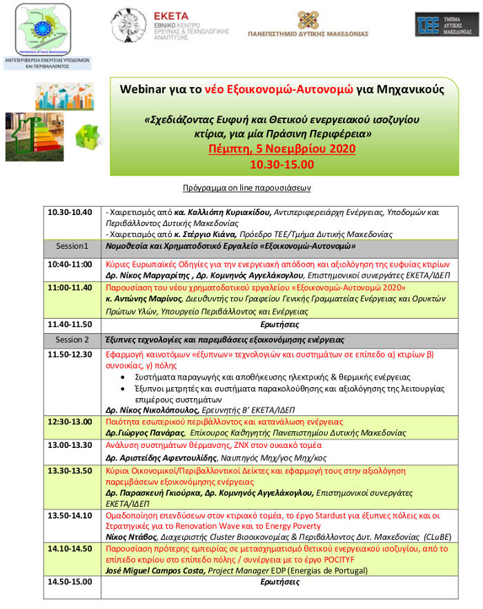 Ενόψει του Προγράμματος «ΕΞΟΙΚΟΝΟΜΩ – ΑΥΤΟΝΟΜΩ» του Υπουργείου Περιβάλλοντος και Ενέργειας, το οποίο για την Περιφέρειά μας ξεκινάει στις 4 Δεκεμβρίου 2020, η Περιφέρεια Δυτικής Μακεδονίας / Αντιπεριφέρεια Ενέργειας, Υποδομών & Περιβάλλοντος προκάλεσε τη διεξαγωγή ενημερωτικού σεμιναρίου (webinar) με τίτλο «Σχεδιάζοντας Ευφυή και Θετικού ενεργειακού ισοζυγίου κτίρια, για μία Πράσινη Περιφέρεια».
