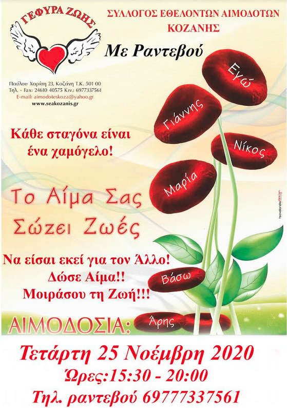 Αιμοδοσία την Τετάρτη 25 Νοέμβρη 2020 από 15:30 – 20:30, στα γραφεία του Συλλόγου, Π. Χαρίση 23 (προσέλευση μέχρι 20:00 -Τρώμε ελαφρύ γεύμα 3ώρες πριν). Μεγάλη έλλειψη και λόγο covid-19. Εσύ; Θα το αποφασίσεις; Σε περιμένουμε!!!