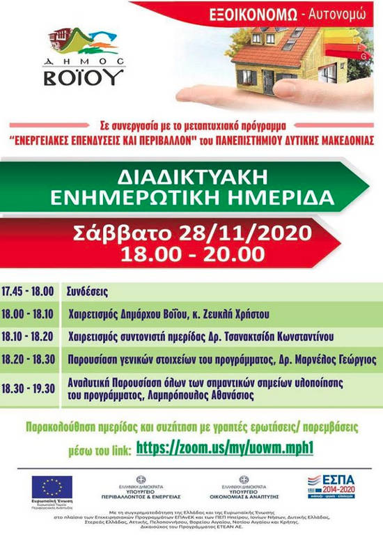 Ο Δήμος Βοΐου σε συνεργασία με το Πανεπιστήμιο Δυτικής Μακεδονίας διοργανώνει διαδικτυακή ημερίδα, το Σάββατο 28 Νοεμβρίου 2020και ώρα 6 μ.μ., προκειμένου να ενημερώσει τους ενδιαφερόμενους για όλες τις πτυχές και δυνατότητες του προγράμματος «Εξοικονομώ -Αυτονομώ». Εξειδικευμένοι επιστήμονες πρόκειται να ενημερώσουν τους συμμετέχοντες καθώς και να απαντήσουν σε όλα τα ερωτήματα τους τα οποία θα υποβληθούν γραπτώς.