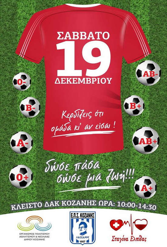 Το Σάββατο 19 Δεκεμβρίου και ώρα 10:00π.μ -14:30μμ θα πραγματοποιηθεί στο κλειστό γήπεδο του Δ.Α.Κ. Κοζάνης εθελοντική αιμοδοσία για την αντιμετώπιση των ελλείψεων αίματος.