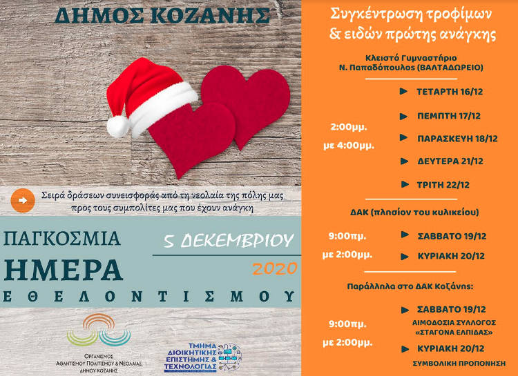 Ο Οργανισμός Αθλητισμού, Πολιτισμού και Νεολαίας (OAΠN) του Δήμου Κοζάνης σε συνεργασία με το Εργαστήριο Επικοινωνία στην Διοίκηση και την Τεχνολογία Του Τμήματος της Διοικητικής Επιστήμης και Τεχνολογίας του Πανεπιστημίου Δυτικής Μακεδονίας, στηρίζει την προσπάθεια νέων παιδιών της πόλης μας, που θέλουν να προσφέρουν υλική και ηθική συμπαράσταση σε όσους συμπολίτες μας χρειάζονται βοήθεια σ’ αυτούς τους δύσκολους καιρούς που ζούμε. Για τον λόγο αυτό, ο ΟΑΠΝ καλεί τους πολίτες να συνδράμουν στην προσπάθεια αυτή ώστε να συγκεντρωθούν τα απαραίτητα τρόφιμα και είδη πρώτης ανάγκης.
