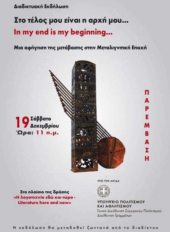 Το λογοτεχνικό περιοδικό Παρέμβαση πραγματοποιεί Διαδικτυακή Εκδήλωση με τίτλο «Στο τέλος μου είναι η αρχή μου: Μια αφήγηση της μετάβασης στην Μεταλιγνιτική εποχή». Η εκδήλωση θα γίνει το Σάββατο 19 Δεκεμβρίου, ώρα 11 π.μ. και θα μεταδοθεί ζωντανά από το διαδίκτυο. Πλαισιώνει την έκδοση ενός βιβλίου με θέμα την μεταλιγνιτική εποχή, το οποίο πρόκειται να κυκλοφορήσει το επόμενο διάστημα. H εκδήλωση πραγματοποιείται στο πλαίσιο της δράσης «Η λογοτεχνία εδώ και τώρα», που τίθεται υπό την αιγίδα του Υπουργείου Πολιτισμού & Αθλητισμού.