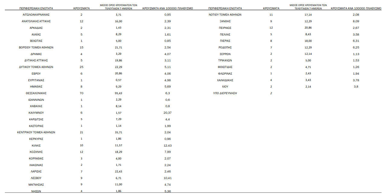 Τέλος, έχουμε 53 ακόμα καταγεγραμμένους θανάτους και 4606 θανάτους συνολικά στη χώρα. 1868 (40.6%) γυναίκες και οι υπόλοιποι άνδρες. Η διάμεση ηλικία των θανόντων συμπολιτών μας ήταν τα 79 έτη και το 95.4% είχε κάποιο υποκείμενο νόσημα ή/και ηλικία 70 ετών και άνω.