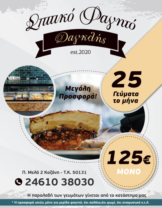 Με τον ερχομό της νέας χρονιάς το κατάστημα «Σπιτικό φαγητό Δαγκλής» στο κέντρο της Κοζάνης σας φέρνει μια προσφορά έκπληξη: