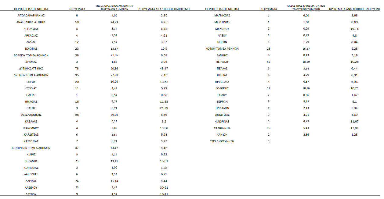 Σήμερα ανακοινώνουμε 816 νέα κρούσματα της λοίμωξης του νέου κορωνοϊού (COVID-19), εκ των οποίων 24 εντοπίστηκαν κατόπιν ελέγχων στις πύλες εισόδου της χώρας. Ο συνολικός αριθμός των κρουσμάτων ανέρχεται στα 142267, εκ των οποίων 52.3% άνδρες. Κατά την ιχνηλάτιση βρέθηκε ότι 5547 (3.9%) θεωρούνται σχετιζόμενα με ταξίδι από το εξωτερικό και 42716 (30.0%) είναι σχετιζόμενα με ήδη γνωστό κρούσμα.
