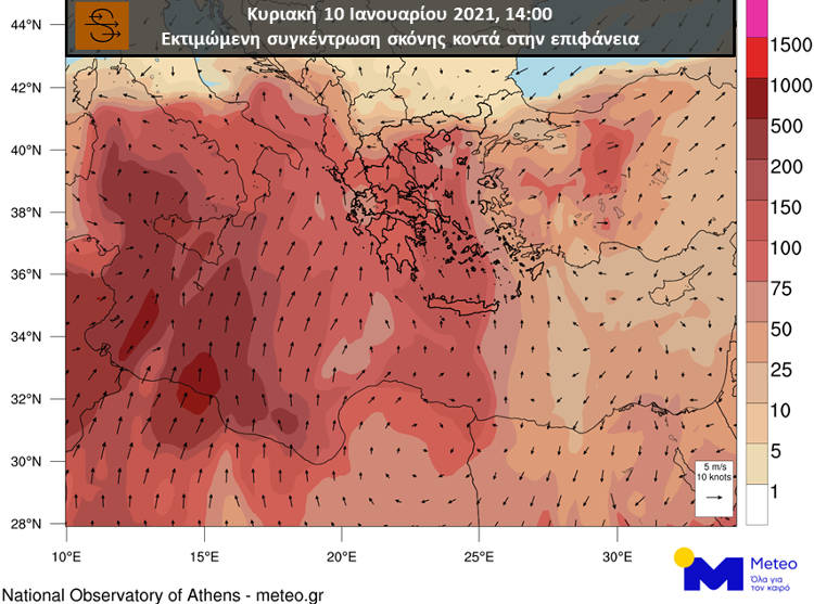 Αυξημένες αναμένεται να είναι οι συγκεντρώσεις σκόνης στην ατμόσφαιρα την Κυριακή 10/01, σύμφωνα με τα δεδομένα του μοντέλου πρόγνωσης συγκέντρωσης σκόνης του Εθνικού Αστεροσκοπείου Αθηνών / Meteo.gr. Οι εκτιμώμενες συγκεντρώσεις σκόνης, κατά τη διάρκεια των μεσημεριανών ωρών της Κυριακής 10/01, παρουσιάζονται στο παρακάτω Σχήμα.