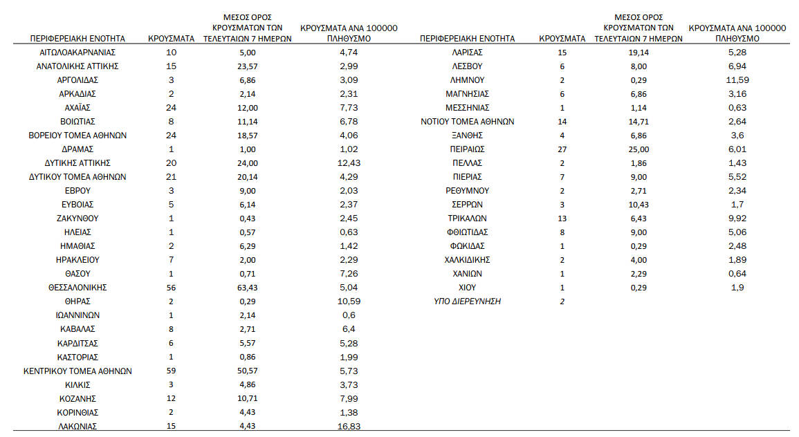 Ο ημερήσιος αριθμός και κρούσματα ανά 100.000 πληθυσμού επιβεβαιωμένων εγχώριων κρουσμάτων COVID-19 ανά περιφερειακή ενότητα στις 11 Ιανουαρίου 2021: