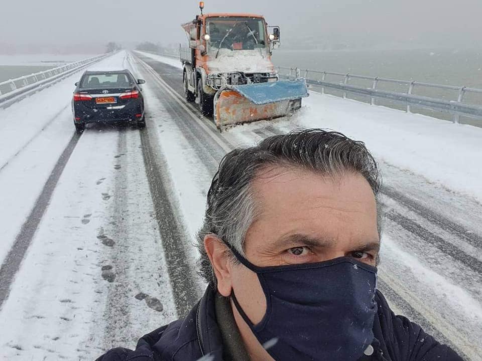 Στη γέφυρα Ρυμνίου στο δρόμο για το Λιβαδερό, με τα μηχανήματα και τους εργαζόμενους της Περιφέρειας στο μέτωπο του χιονιά και των χαμηλών θερμοκρασιών βρέθηκε το Σάββατο 16 Ιανουαρίου 2021 ο Περιφερειάρχης Δυτικής Μακεδονίας Γιώργος Κασαπίδης.