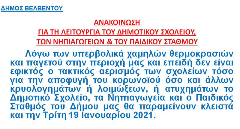 Σέρβια - Βελβεντό 18/01/2021 Δείτε την ανακοίνωση για τη λειτουργία των σχολείων στον Δήμο Βελβεντού 0 Δείτε την ανακοίνωση για τη λειτουργία των σχολείων στον Δήμο Βελβεντού: