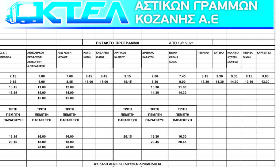 Η ΚΤΕΛ Αστικών Γραμμών Κοζάνης Α.Ε. με αφορμή τα νέα δεδομένα που προκύπτουν από το νέο πρόγραμμα λειτουργίας του εμπορικού συλλόγου Κοζάνης, τροποποιεί το πρόγραμμα δρομολογίων της μέχρι νεωτέρας εξέλιξης.