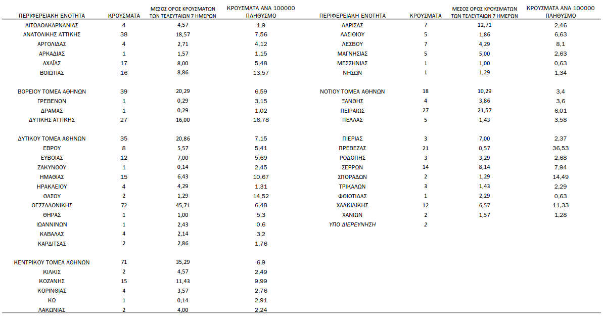 Τέλος, έχουμε 30 νέους θανάτους από τη νόσο COVID-19, φθάνοντας τους 5518 θανάτους συνολικά στη χώρα, εκ των οποίων 3254 (59.0%) άνδρες. Η διάμεση ηλικία των θανόντων συμπολιτών μας ήταν τα 79 έτη και το 95.4% είχε κάποιο υποκείμενο νόσημα ή/και ηλικία 70 ετών και άνω.